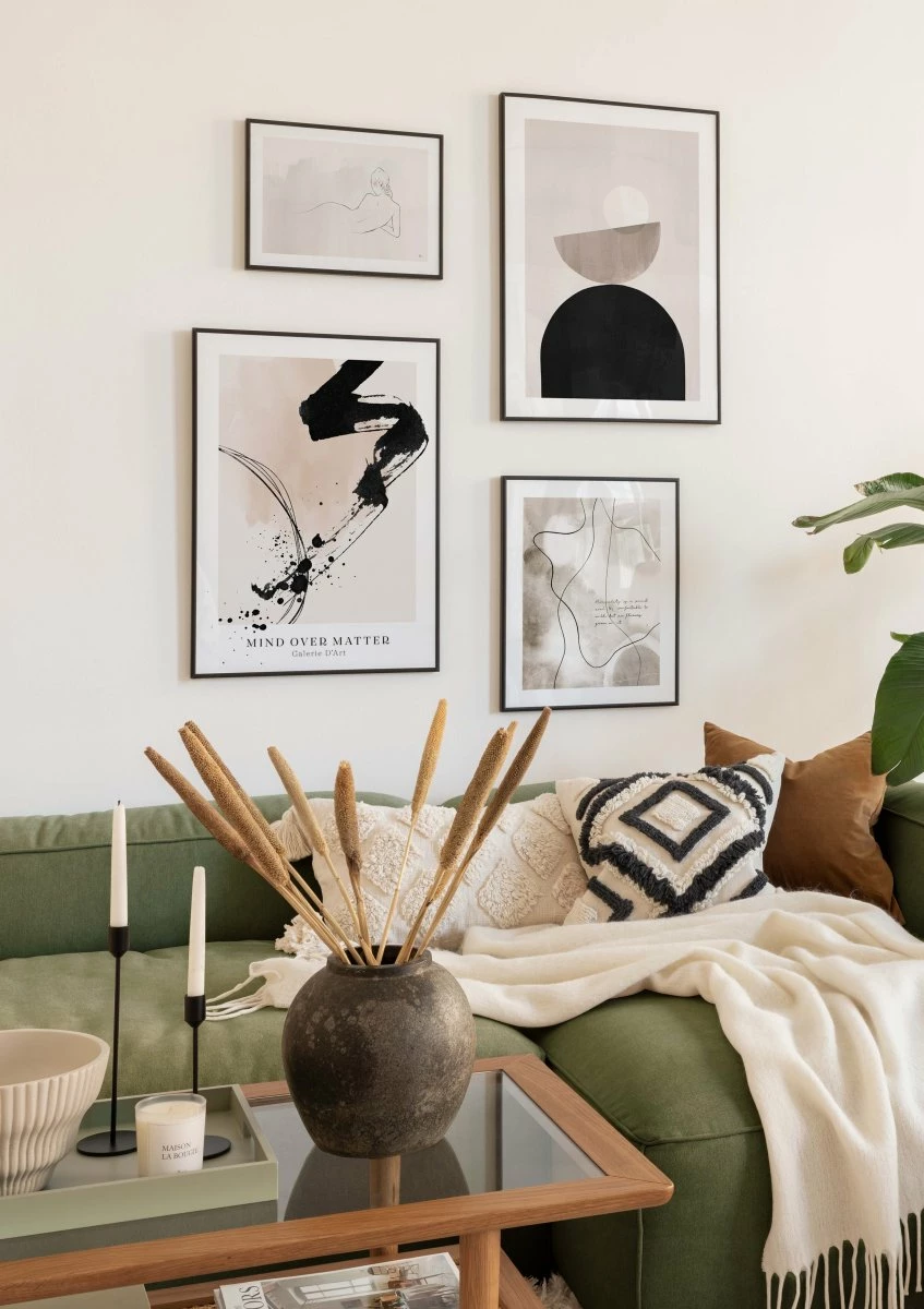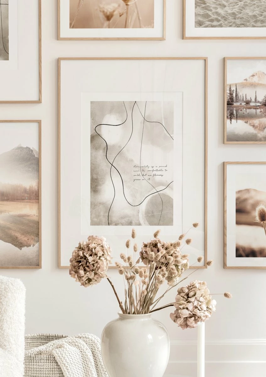 En abstrakt kunstplakat med en buet sort streg på en grå-beige akvarel og et citat af Vincent Van Gogh: “Normality is a paved road: It’s comfortable to walk, but no flowers grow on it.” Lad blomsterne blomstre ved at finde og gå dine egne veje.