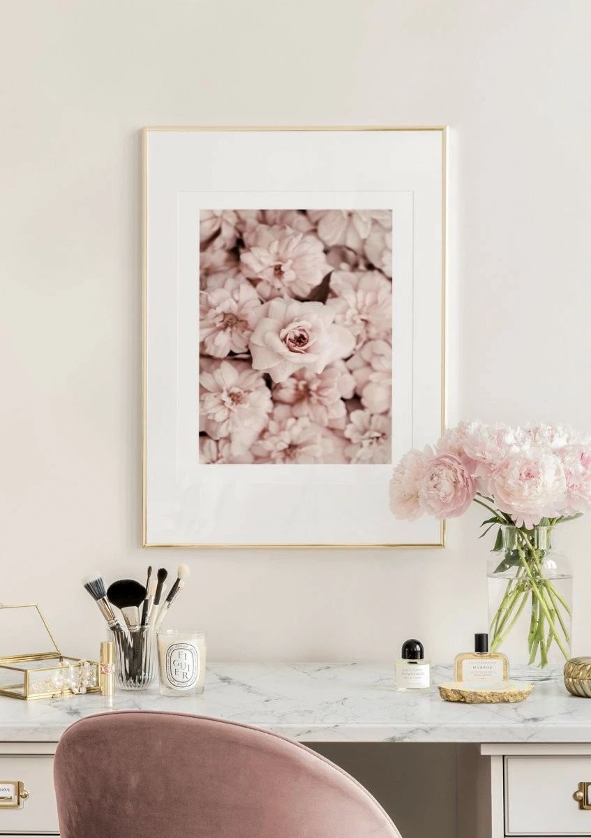 Botanisk plakat med et smukt motiv af et hav af lyserøde nelliker i nærbillede. Motivet fungerer perfekt til at kombinere med plakater i lignende farveskalaer eller med vores andre botaniske plakater. Plakaten har en indbygget passepartout, der rammer motivet på en elegant måde.