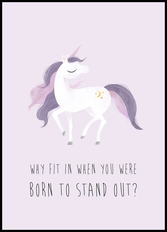 En fantasifuld børneplakat med en sød hvid og lyserød enhjørning på en lilla baggrund med teksten “Hvorfor passe ind, når du er født til at skille dig ud?” Denne smukke og frække plakat vil altid minde dig om at forblive tro mod dig selv og opmuntre dig til at være den dronning, du er. Denne plakat er et absolut blikfang, der vil inspirere til selvtillid og uafhængighed og er det perfekte print til børneværelset eller børneværelset.