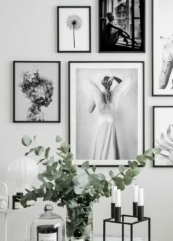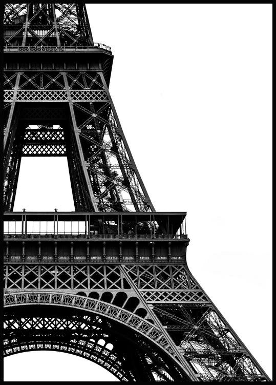 Smuk sort-hvid plakat med et nærbillede af det berømte Eiffeltårn. Vidste du at Eiffeltårnet i Paris er den højeste bygning i Frankrig? Tag denne berømte seværdighed med ind i dit hjem og nyd den hver eneste dag.