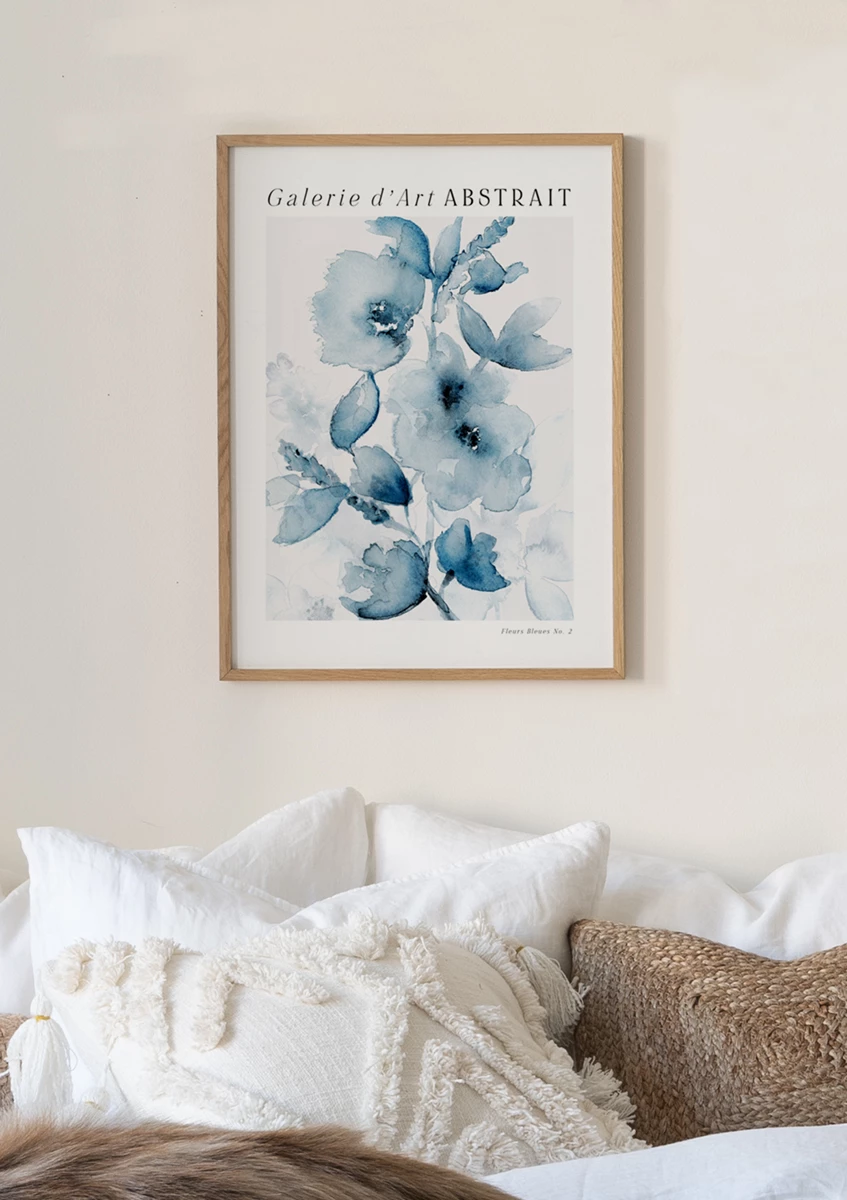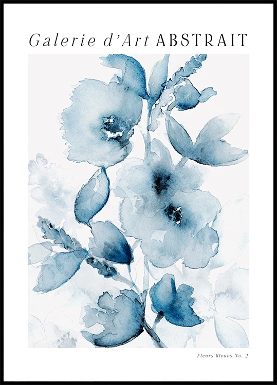 Plakat med blå akvarelblomster på beige baggrund med teksten “Galerie d’Art ABSTRAIT – Fleurs Bleues No.2”. Dejligt kunsttryk at tilføje til stuen eller soveværelset. Plakat har en hvid margen, der indrammer motivet.