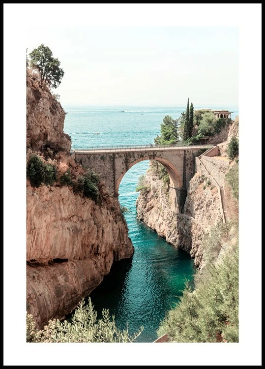 En fortryllende landskabsplakat forestillende den smukke Furore Fjord i Italien. Man kan krydse fjorden over en 30 meter høj bro, hvorfra man også har en unik udsigt over havet. Et orange hus ligger på klippen og er omgivet af cypreser.