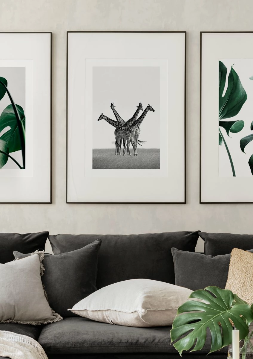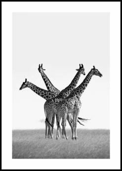 En sjov sort/hvid plakat med fire giraffer på savannen, der kigger i forskellige retninger. Girafferne står tæt sammen, og ved et hurtigt blik ser det ud til, at der kun er to giraffer med to halse hver. Bring en god stemning og skøn harmoni ind i dit hjem med sjove dyreplakater. Sorte og hvide plakater er nemme at indrette med og passer til enhver indretningsstil.