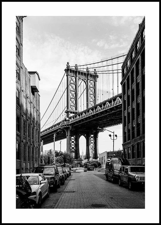 Betagede sort/hvid plakat ad Manhatten Bridge. Hængebroen blev bygget i 1909, og den forbinder Brooklyn med Lower Manhatten i en smukke by, New York.Fra broen har du en fantastisk udsigt over Manhattens skyline og Brooklyn Bridge. Denne arkitekturplakat vil passe perfekt ved siden af andre New York-relaterede plakater. Plakaten er designet med en hvid kant som ramme om billedet, der giver det mere dybde og fremhæver motivet.