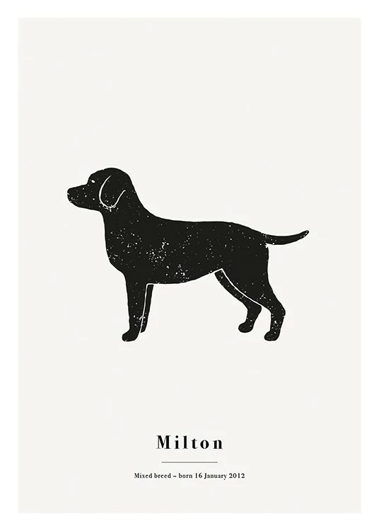 Illustration, der forestiller en sort labrador med hvide pletter, på en lysegrå baggrund og tekst nedenunder. Personlige plakater giver dig mulighed for at tilpasse din helt egen plakat ved enten at tilføje tekst, navne eller datoer. Det er både en sjov måde at skabe personlig kunst til sig selv på og personlige gaver til andre.