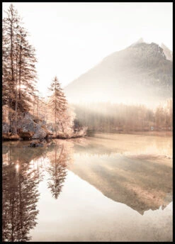 Smuk naturplakat med en tåget solopgang over en sø. Det tætbevoksede bjerg og træerne spejles i vandet og solen bader motivet i lys og giver en smuk atmosfære. Denne landskabsplakat er for alle naturelskere og kan kan blive ved at forundre.