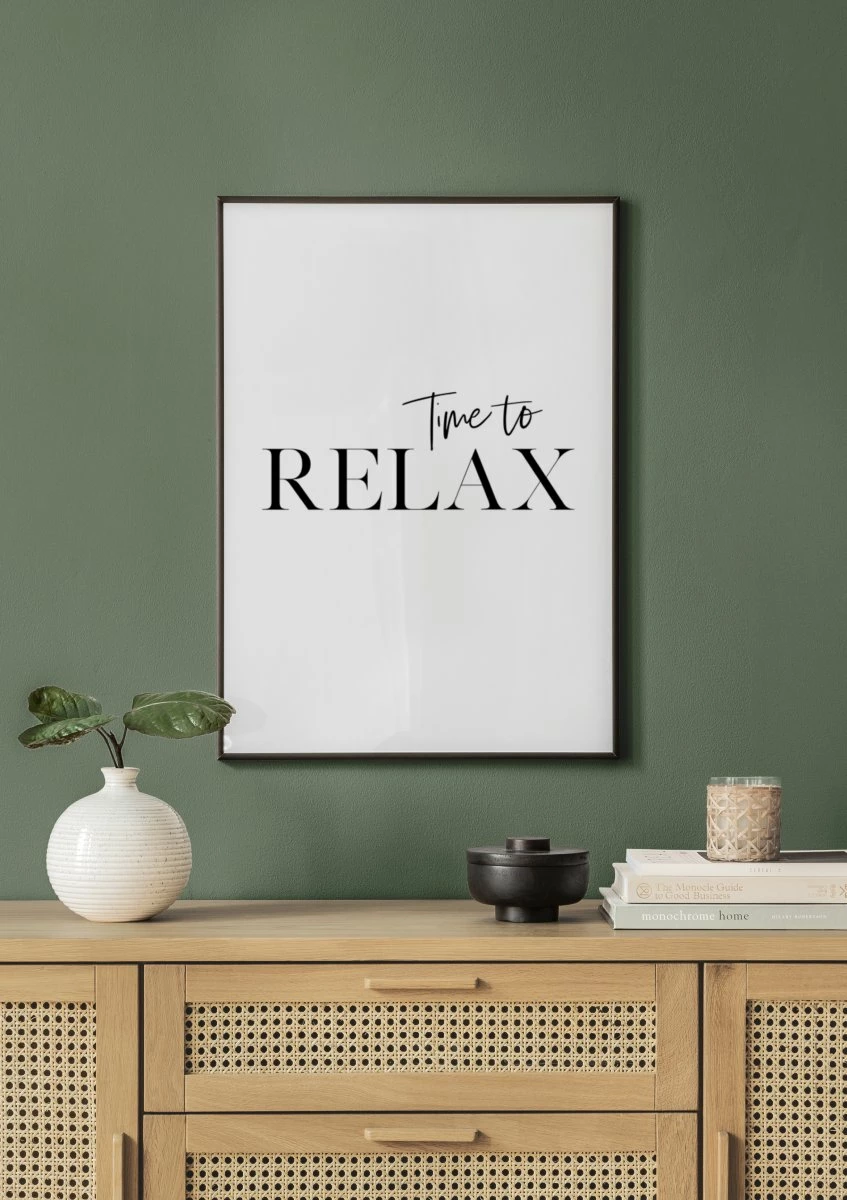 Smuk tekstplakat der minder os om at læne os tilbage og slappe af. Med sorte bogstaver på hvid baggrund står skrevet “Time to relax”. Denne sort-hvid plakat passer perfekt ind i stuen eller soveværelset.