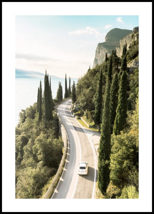En fantastisk landskabsplakat med en bil, der kører på en smuk vej langs Gardasøen i Tremosine sul Garda, Italien. Vejen bugter sig langs Gardasøens bred forbi klipper og træer med konstant udsigt over det krystalklare vand. Indret hjemmet med landskabsplakater og -posters, der er rige på farve, glitter og naturlig skønhed.